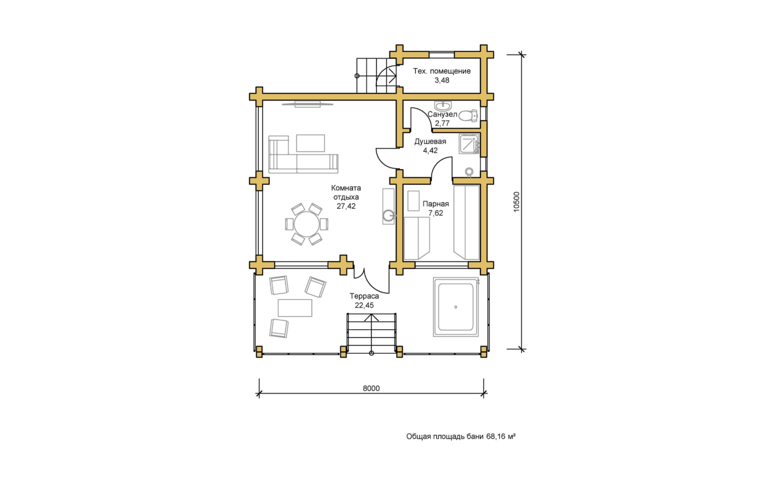 Проект одноэтажной каркасной бани или гостевого дома «Гринфилд» – это баня площадью 68 м², идеальное место для отдыха и восстановления сил, где каждая деталь продумана для максимального комфорта и расслабления.