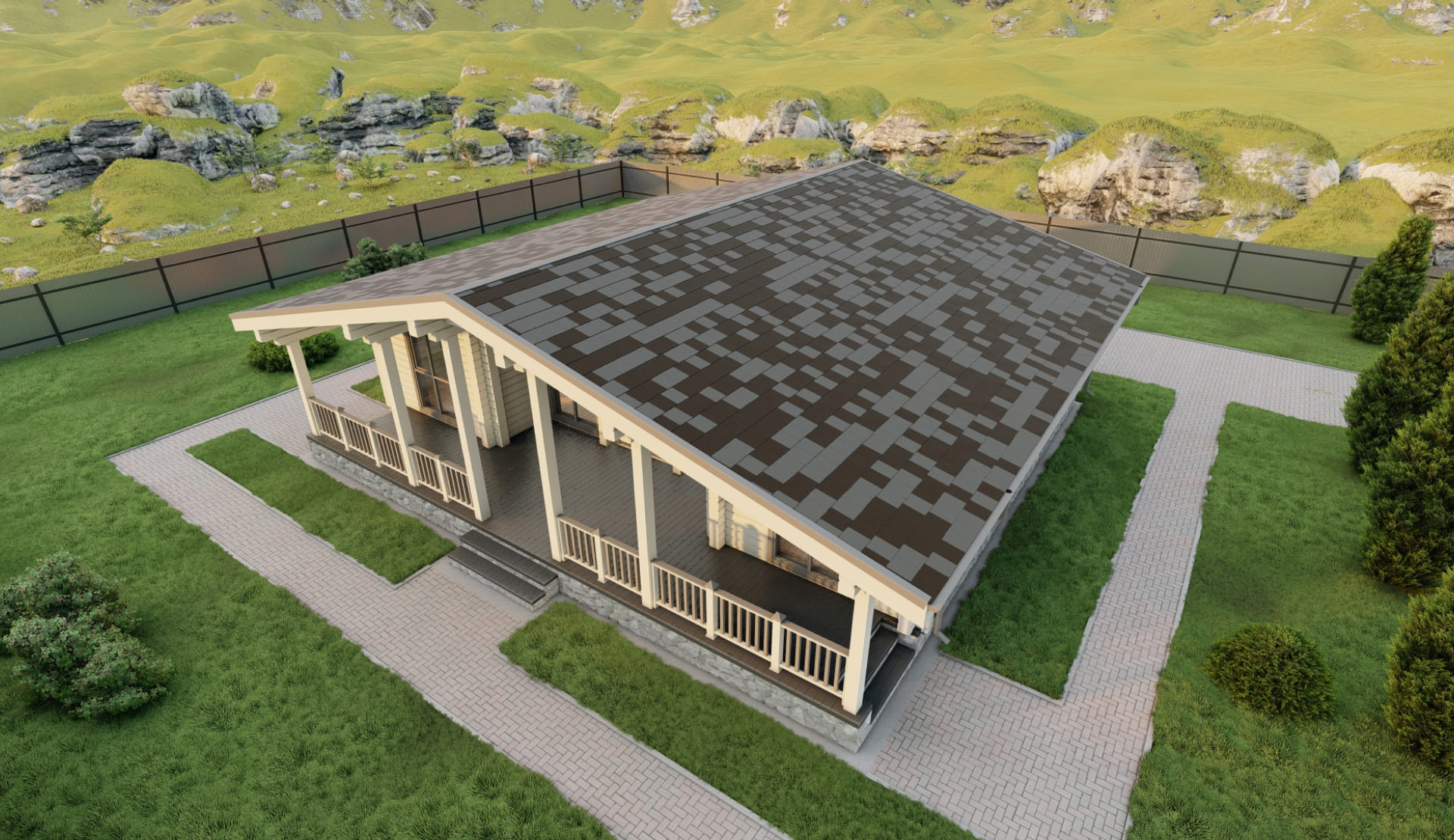 «Каспий» - одноэтажный каркасный дом с тремя просторными спальнями и шикарной террасой. Готовый проект под ключ.