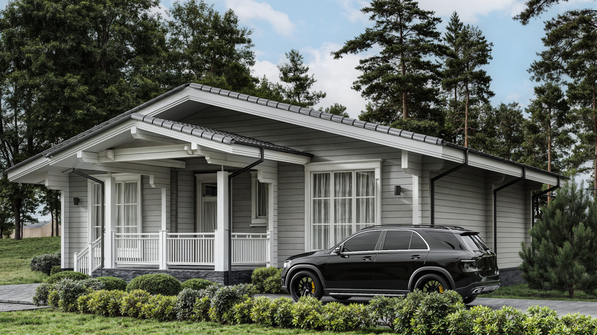 «Тихая гавань» - Одноэтажный каркасный дом с просторной кухней гостиной и двумя комфортными спальнями. Готовый проект под ключ.