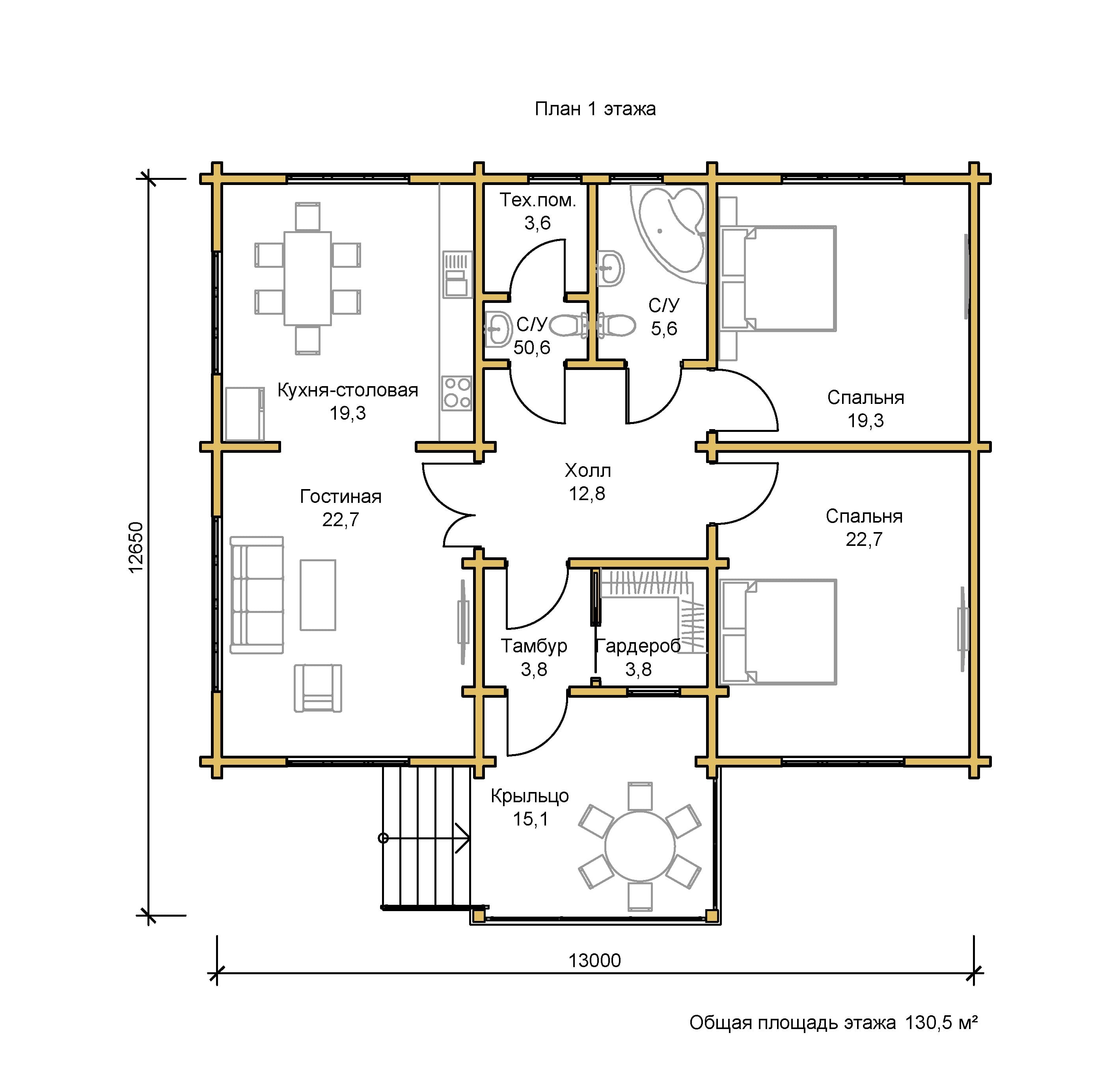 Проект каркасного дома «Тихая гавань» – это идеальное пространство, где уют и функциональность встречаются в гармонии: одноэтажный каркасный дом площадью 131 м², воплощающий в себе все современные тенденции и комфорт. Идеально подойдет для небольшой семьи или пары, стремящихся к просторному комфорту в загородной жизни. На входе в дом вас встречает светлый и просторный холл, который плавно переходит в большую кухню-гостиную. Это сердце дома, где можно не только готовить вкусные блюда, но и проводить время с семьей и друзьями. Просторная кухня, оснащенная современными бытовыми приборами и стильными гарнитурами, открывается на уютную зону отдыха с мягкой мебелью и большими окнами, заполняющими пространство естественным светом.